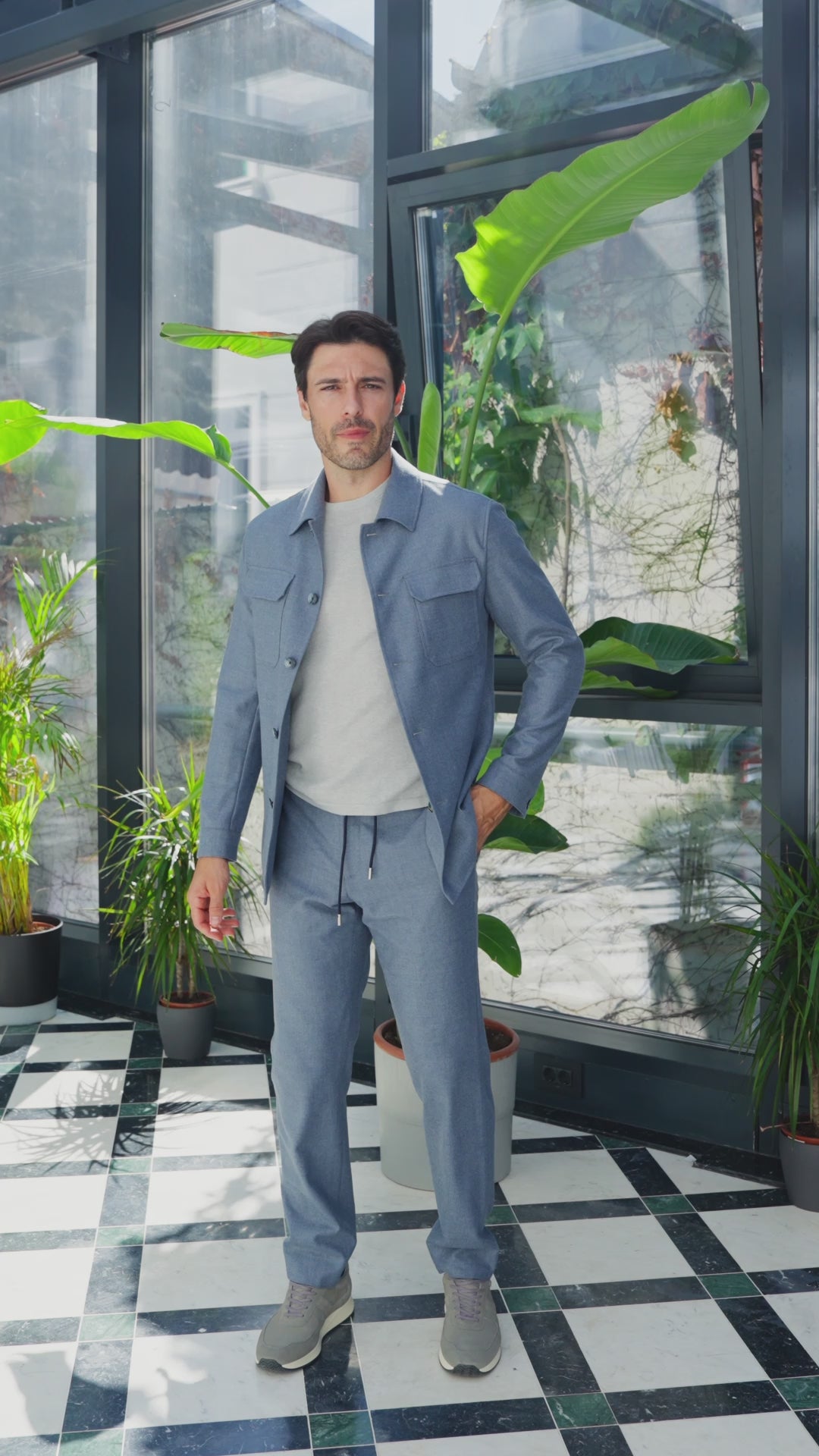 Țesătura exclusivistă Loro Piana conferă un aer sofisticat, transformând un outfit relaxat într-o expresie de lux discret. Look-ul este completat de runners, pentru un echilibru perfect între funcționalitate modernă și eleganță relaxată.