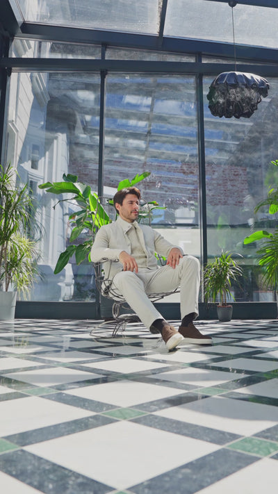 Ținuta este completată de un pulover cable-knit, ce îmbină tradiția cu rafinamentul contemporan, creând un echilibru perfect între confort și exclusivitate.