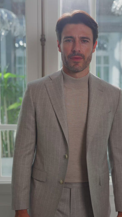Un costum care redefinește eleganța prin simplitate și exclusivitate. Realizat dintr-o țesătură spectaculoasă Loro Piana, un blend rafinat de lână și cașmir, acest outfit surprinde esența luxului discret.